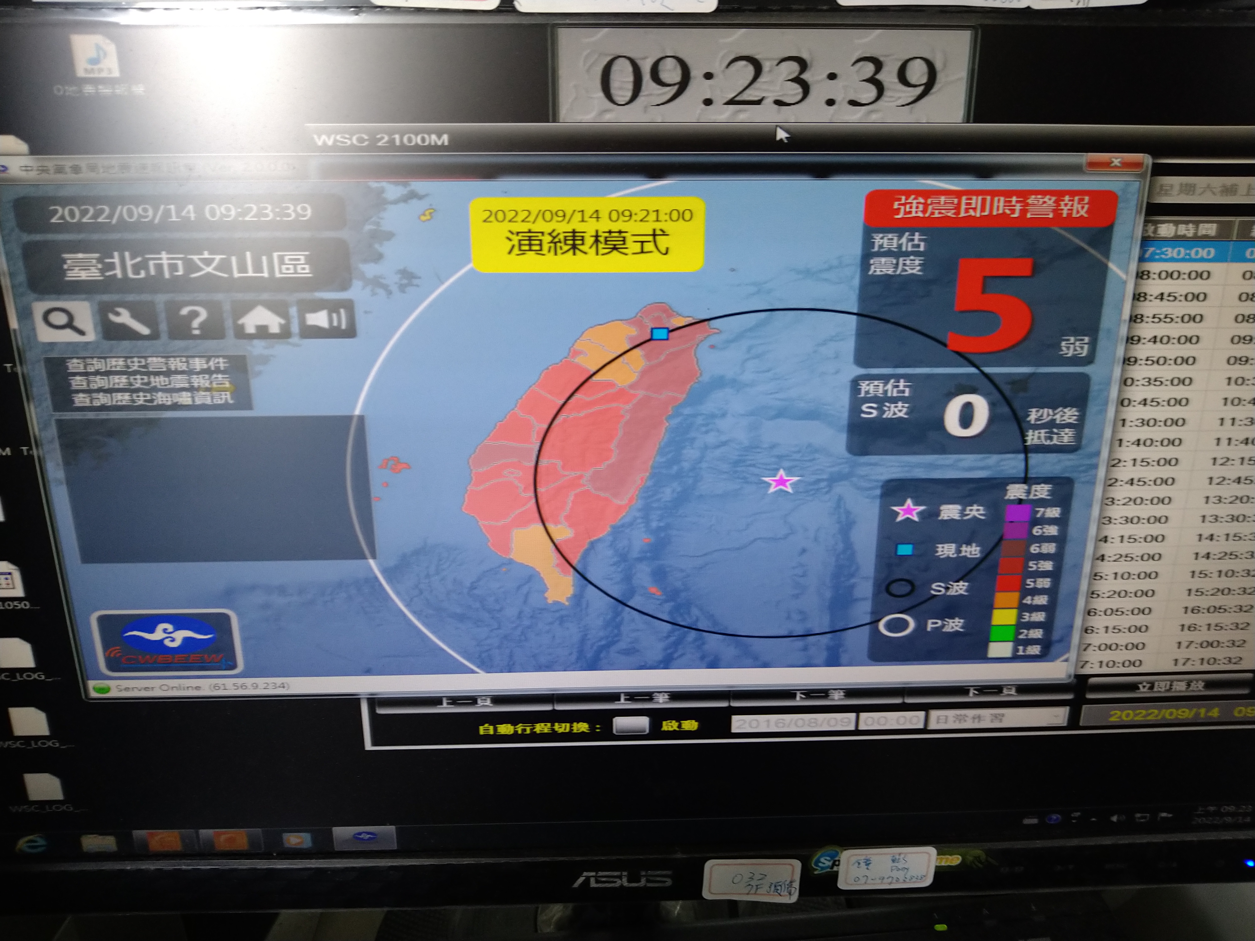 下圖為111-09-14 學校接收到發出強震模擬警報的畫面