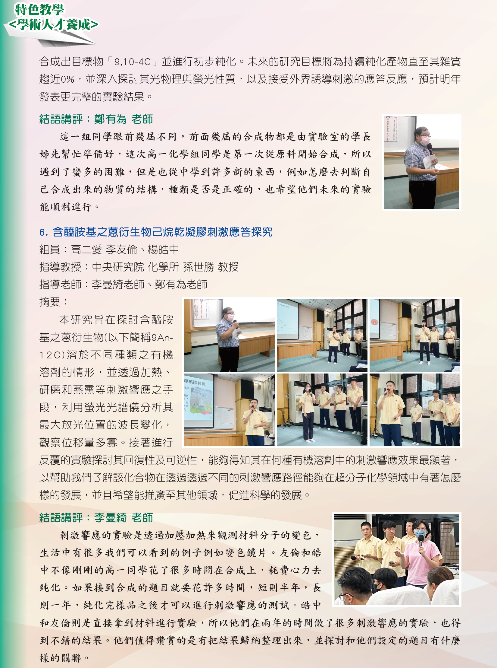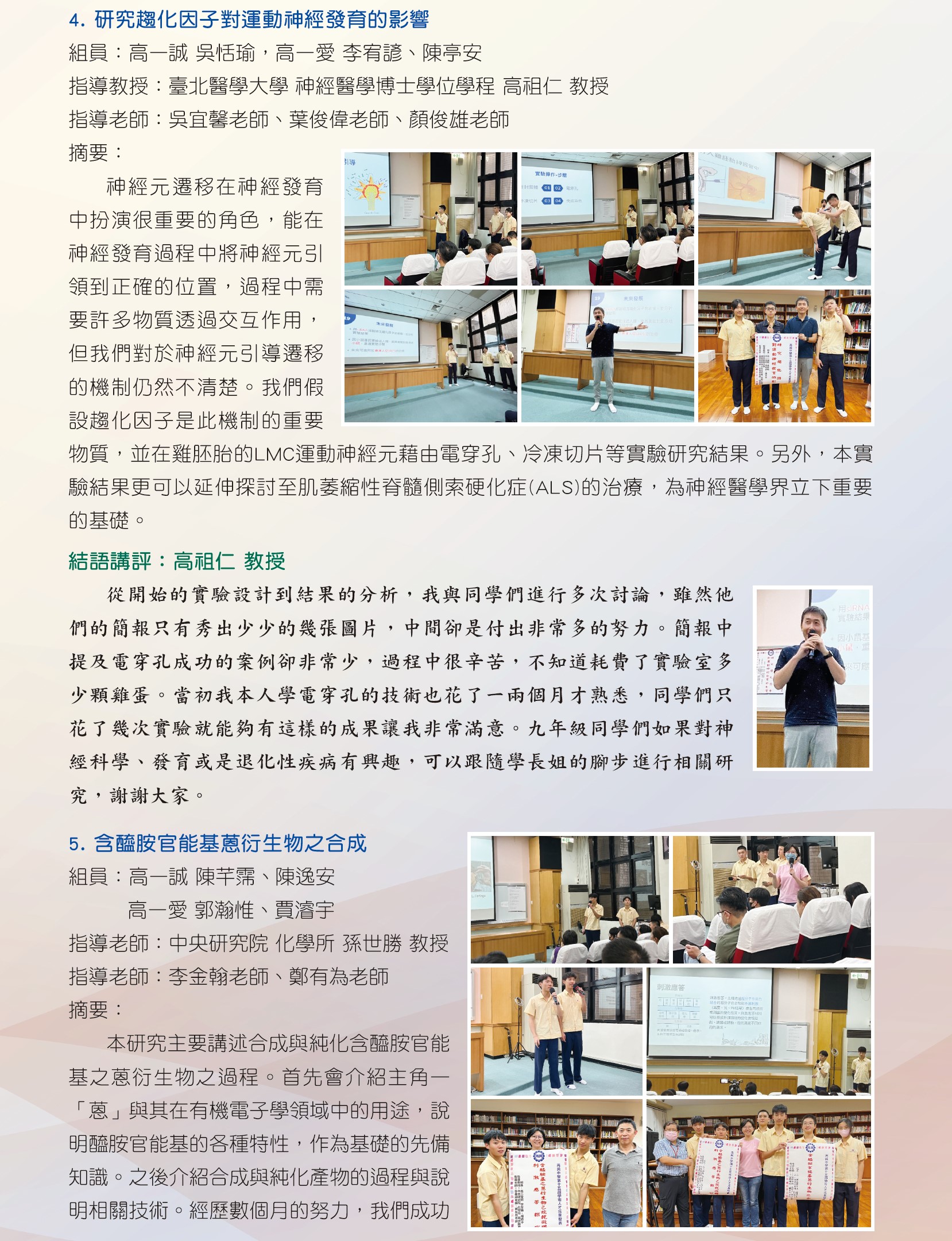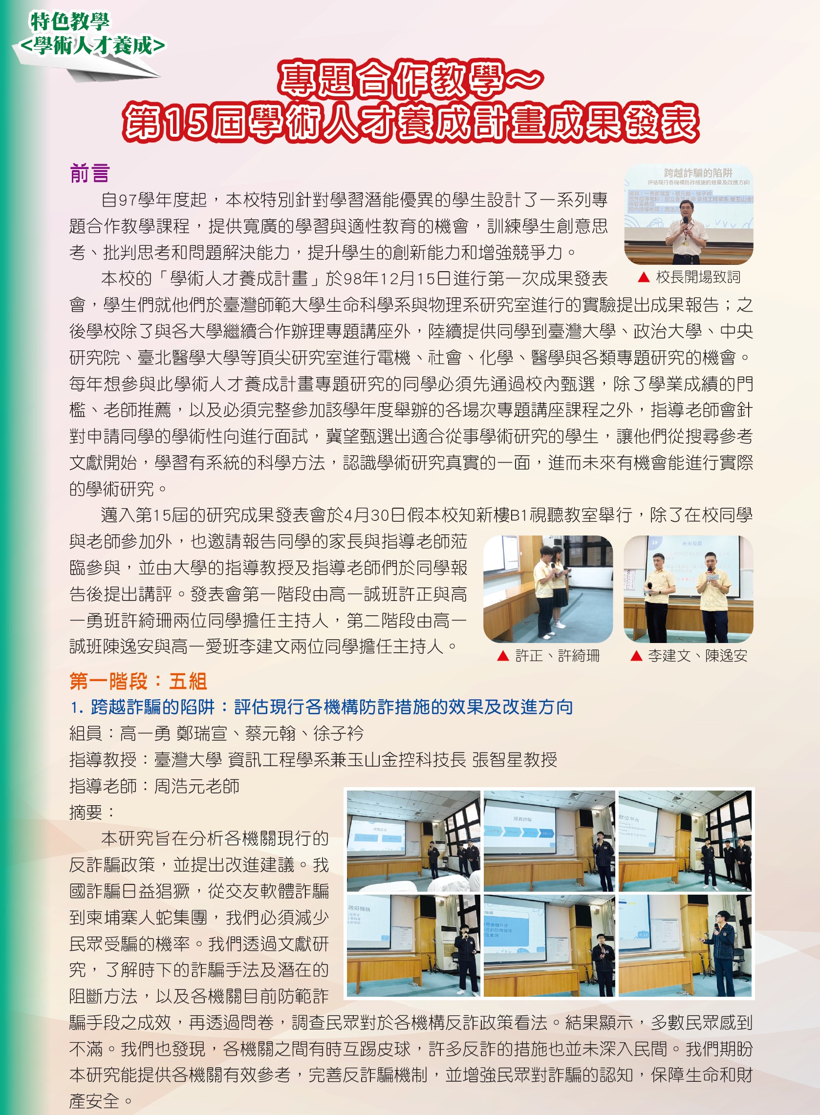 第15屆的研究成果發表會於4月30日假本校知新樓B1視聽教室舉行,除了在校同學與老師參加外,也邀請報告同學的家長與指導老師蒞臨參與,並由大學的指導教授及指導老師們於同學報告後提出講評。發表會第一階段由高一誠班許正與高一勇班許綺珊兩位同學擔任主持人,第二階段由高一誠班陳逸安與高一愛班李建文兩位同學擔任主持人。