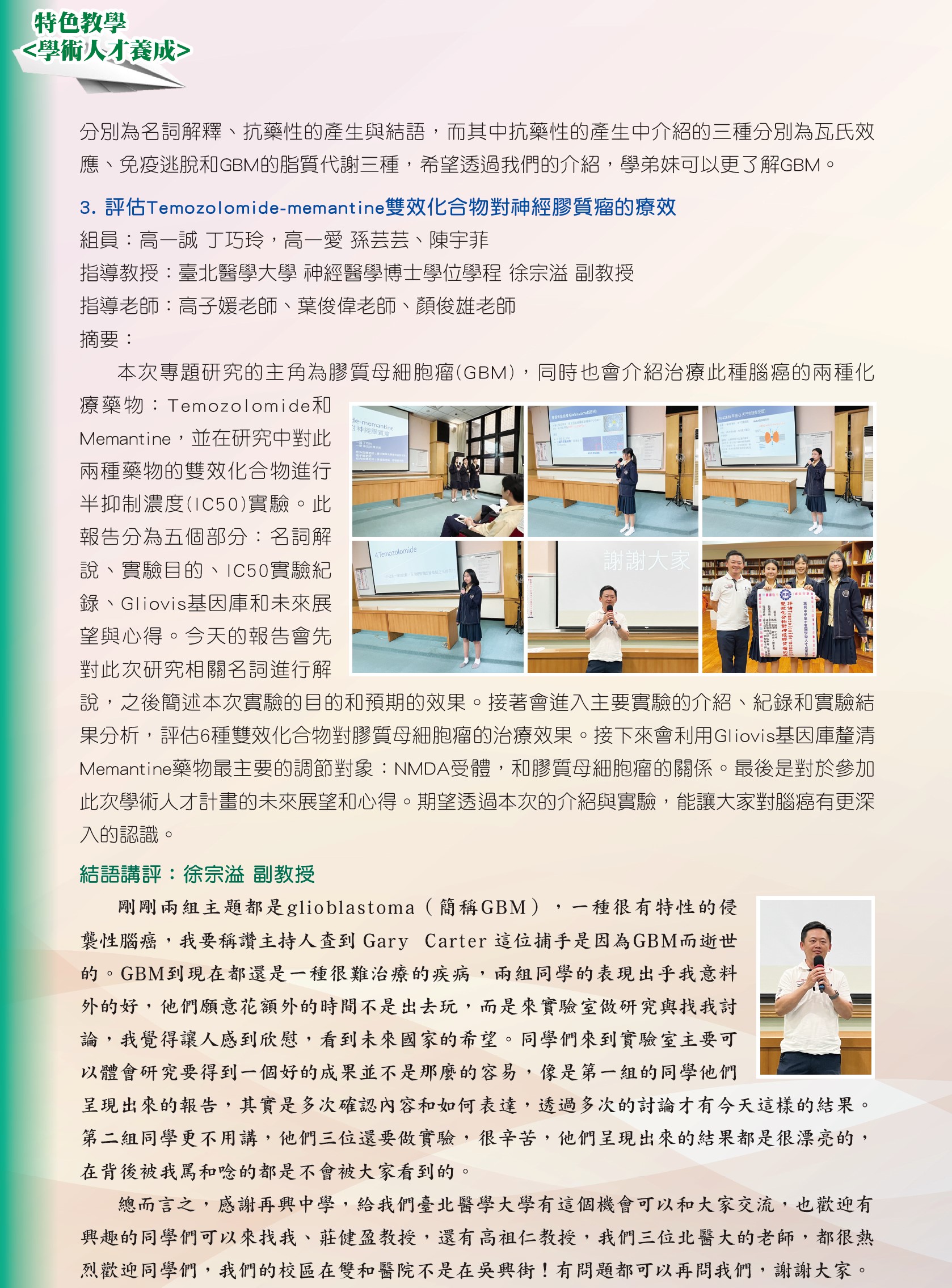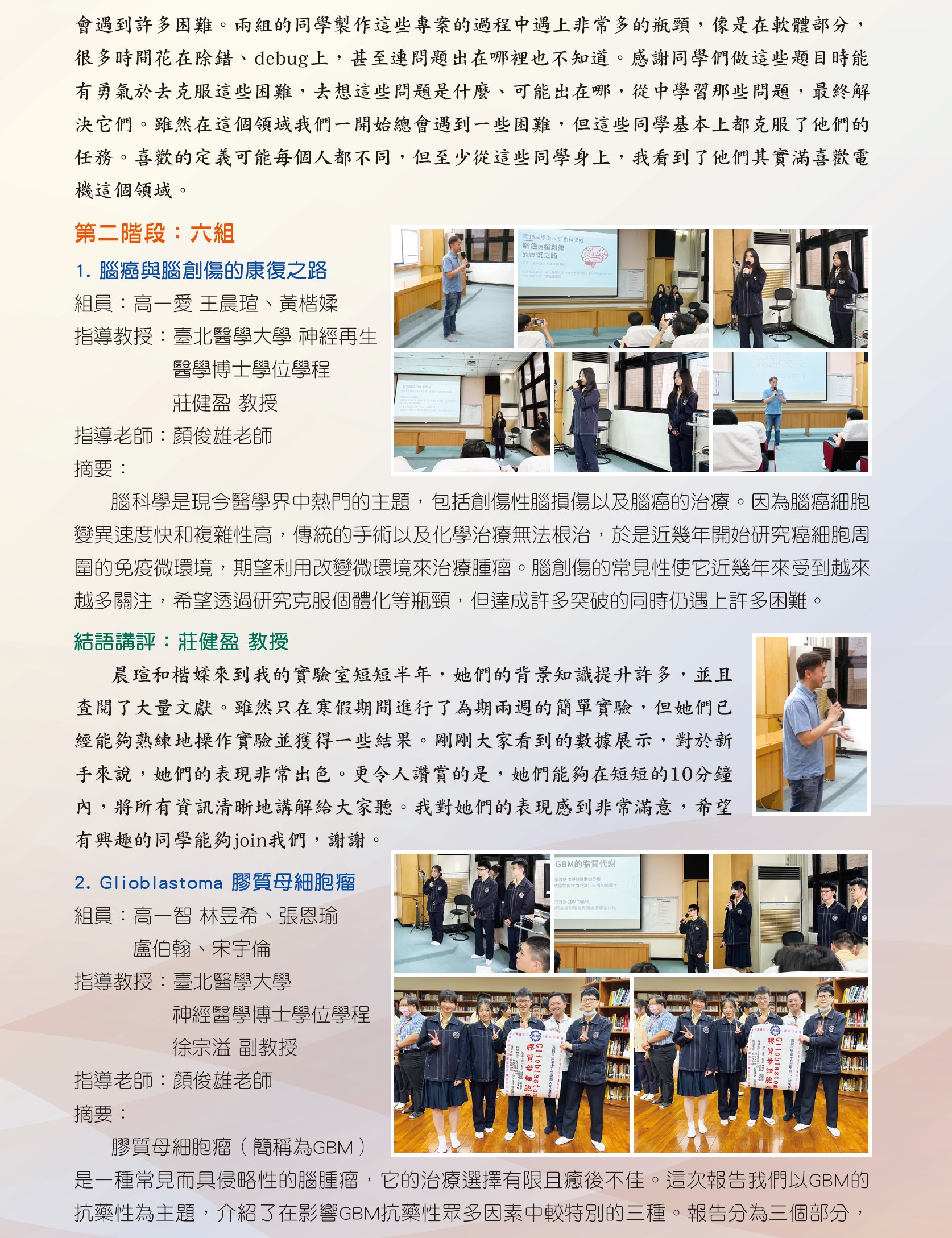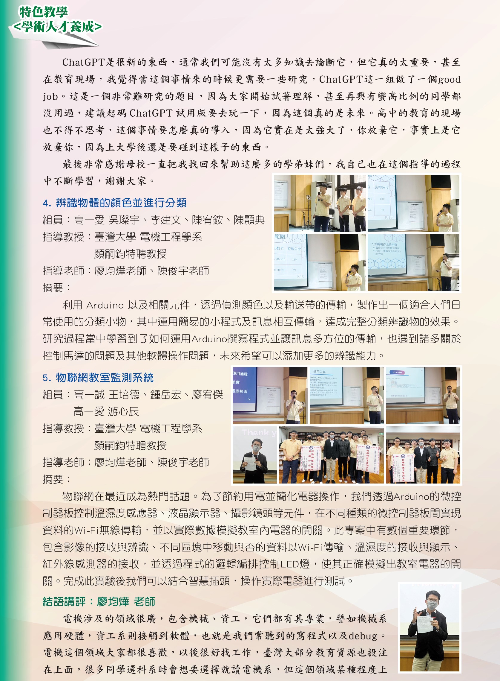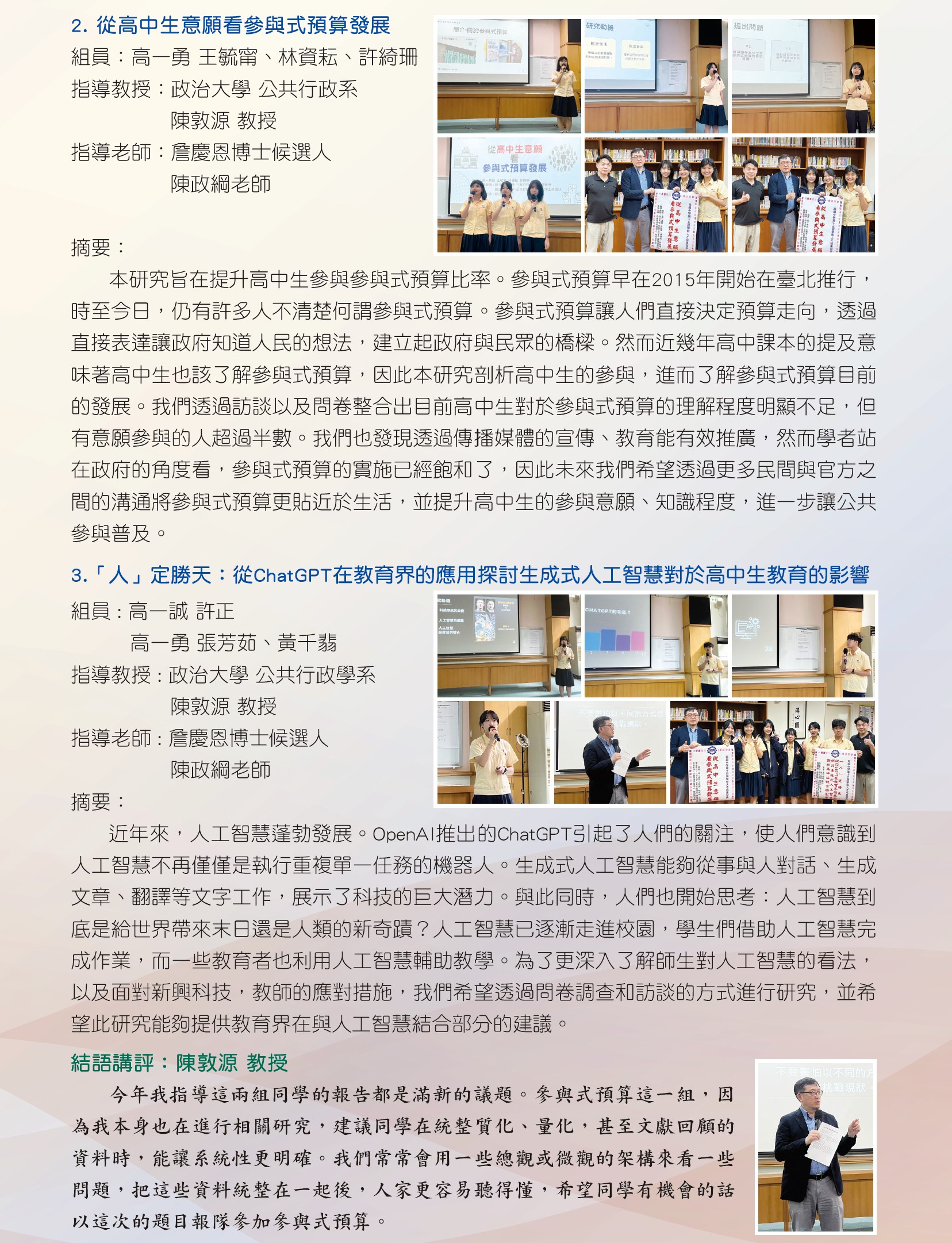 第15屆的研究成果發表會於4月30日假本校知新樓B1視聽教室舉行,除了在校同學與老師參加外,也邀請報告同學的家長與指導老師蒞臨參與,並由大學的指導教授及指導老師們於同學報告後提出講評。發表會第一階段由高一誠班許正與高一勇班許綺珊兩位同學擔任主持人,第二階段由高一誠班陳逸安與高一愛班李建文兩位同學擔任主持人。