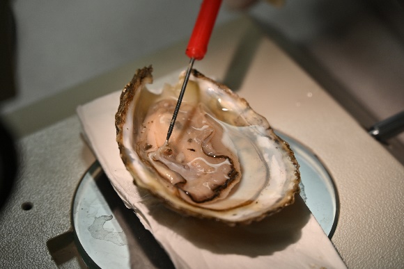 Dr. Freeman帶著學生在課室實驗中進行牡蠣解剖,藉由顯微鏡觀察牡蠣的生理構造,以及在牡蠣身上存留的藻類及浮游生物。教授特別讓學生觀察牡蠣的鰓,由於牡蠣是過濾性攝食者,鰓上有纖毛結構,能將水中的營養物質和可食用顆粒分離,甚至能過濾掉海水中的汙染物,所以在受汙染的水域內養殖牡蠣,可以達到淨化水質的效果。