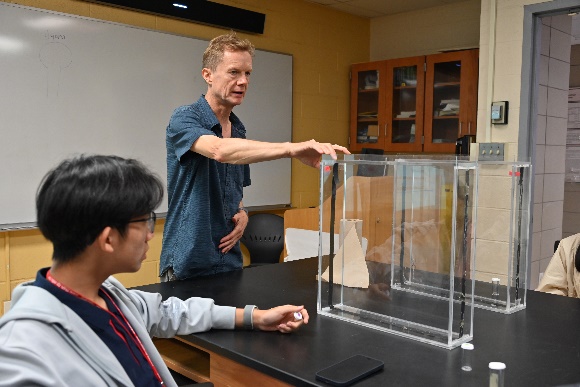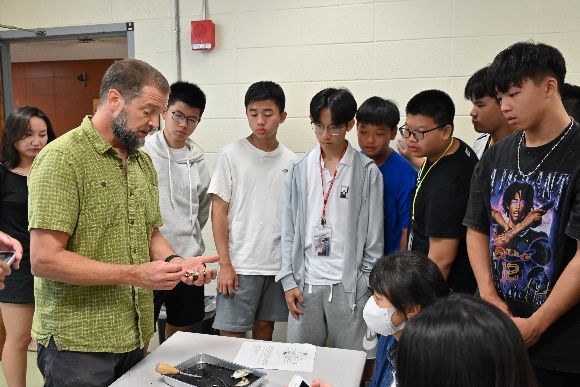Dr. Kilgore的地質檢測實驗,帶領學生透過砂石的分層取樣與成分分析,了解沉積物的結構,以推導出其環境的變遷。海洋環境變遷課程則是講述冰河及冰山的形成過程,在全球二氧化碳排放過多造成暖化的情況下,冰川消融進而導致海平面上升,若不改善,許多地方將在多年後沉沒在海裡。課堂上教授也安排手作砂土畫,帶大家了解沉積物的組成、顆粒大小及其外觀的特徵。