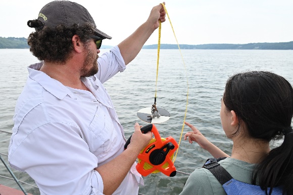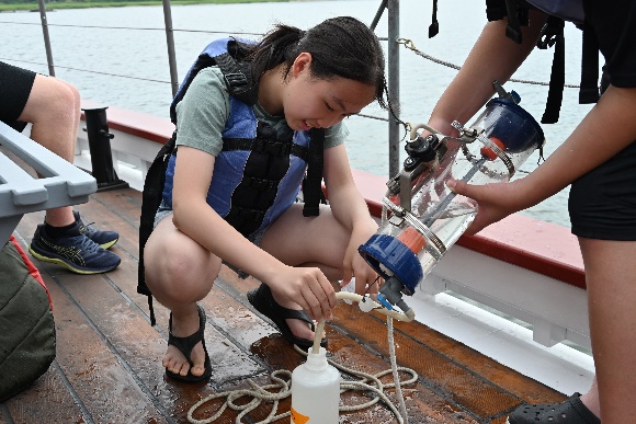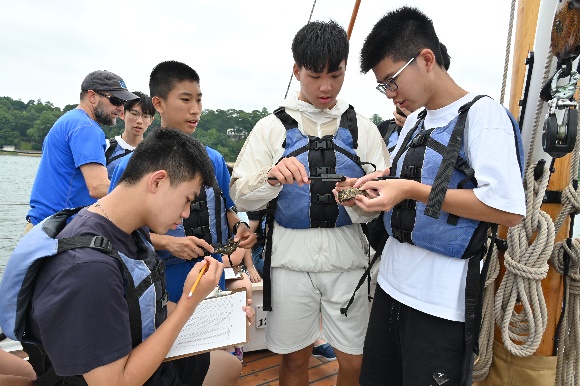 Dr. Freeman與Dr. Wallace帶領高年級組學生至牡蠣灣進行野外探勘,搭船前往各個牡蠣殼的投放點,進行海水以及牡蠣的採集,藉此研究牡蠣改善河口優養化的成效。為了讓實驗的對照組更加多元,每當有搭船戶外教學的行程,Dr. Wallace都非常熱心地攜帶探勘設備,隨時準備好採集。學生在每個投放點須紀錄牡蠣生長的尺寸,採集量越多,精確度越高,學生也利用沙奇盤觀察海水的濁度以進行海水檢測,在沙奇盤不可見的情況下記錄深度,隨後依據沙奇盤測量的深度將採水器投放至海裡採集海水,記錄海水的溫度,並做錠劑檢測,測量含氧量、酸鹼值、大腸桿菌量、磷酸鹽、硝酸鹽、鹽度等。